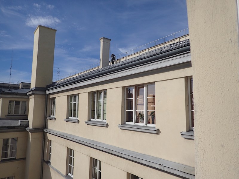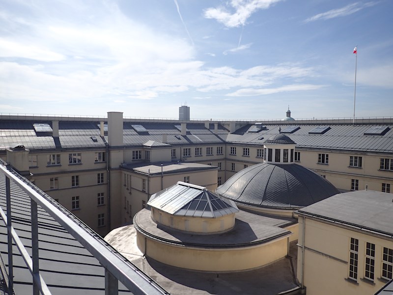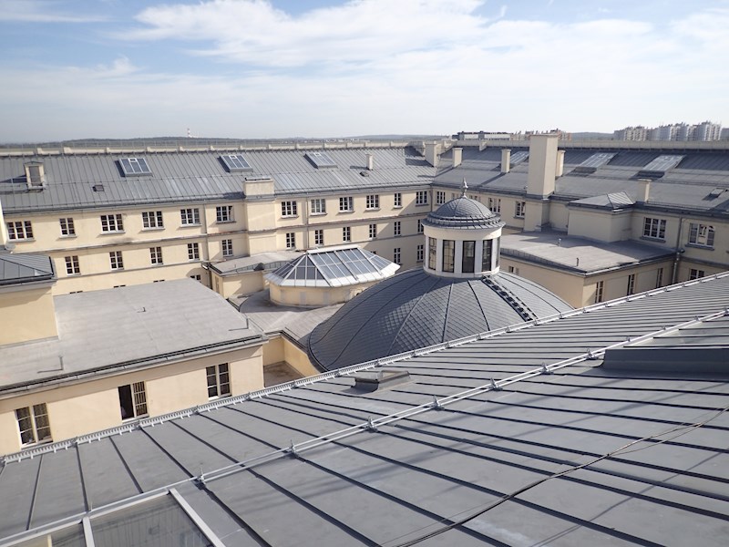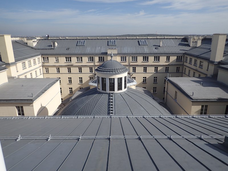 Montaż płotków przeciwśniegowy na dachach Śląskiego Urzędu Wojewódzkiego w Katowicach.
