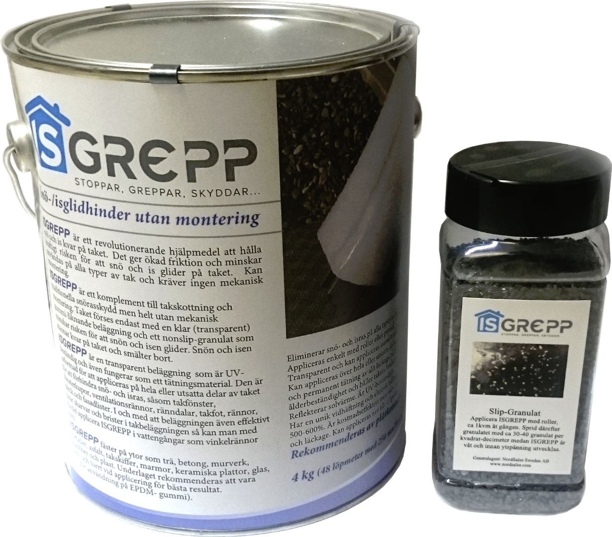 ISGREPP är en transparent beläggning som är UV-beständig och även fungerar som ett tätningsmaterial. Den är utformad för att appliceras på hela eller utsatta delar av taket för att förhindra snö- och isras, såsom takfönster, fönsterkupor, ventilationsrännor, ränndalar, takfot, rännor, bleck och fasadlister. I och med att beläggningen även effektivt tätar skarvar och brister i takbeläggningen så kan man med fördel applicera ISGREPP i vattengångar som vinkelrännor mm.