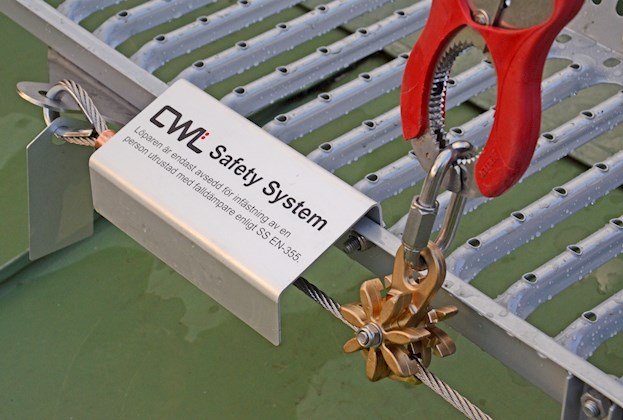 - Vajer eller skena monterad med 0-15 grader - 2,5 meter om man ska kunna arbeta vid sidan på sluttande tak.